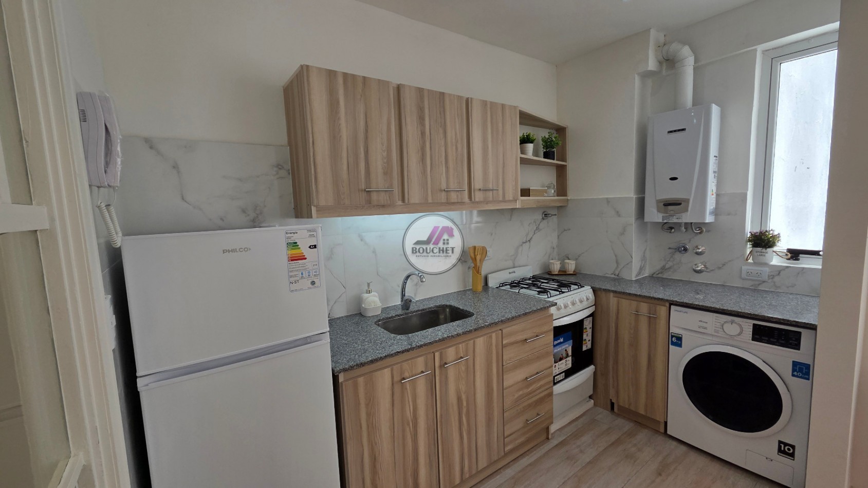 La cocina integrada, con ventilación natural, fue reciclada a nuevo y se encuentra equipada con lavarropas, combinando diseño y funcionalidad.
