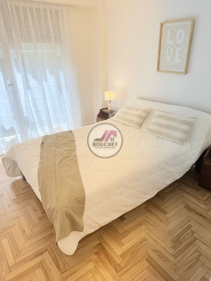 * Dormitorio principal a la calle, con balcón francés, pisos de parquet lustrado y plastificado, amplio placard con baulera. Se entrega con cama de dos plazas, mesas de luz y ropa de cama.