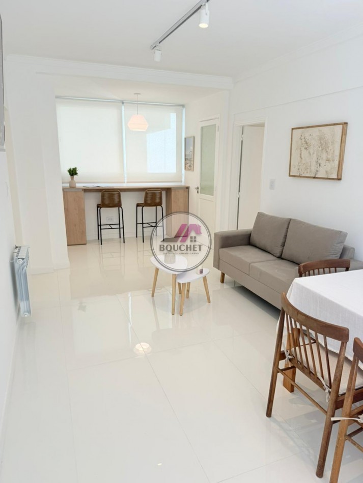 El living-comedor es amplio y luminoso, con salida directa al balcón, y se complementa con una barra desayunadora con mueble de apoyo, aportando funcionalidad y diseño.
