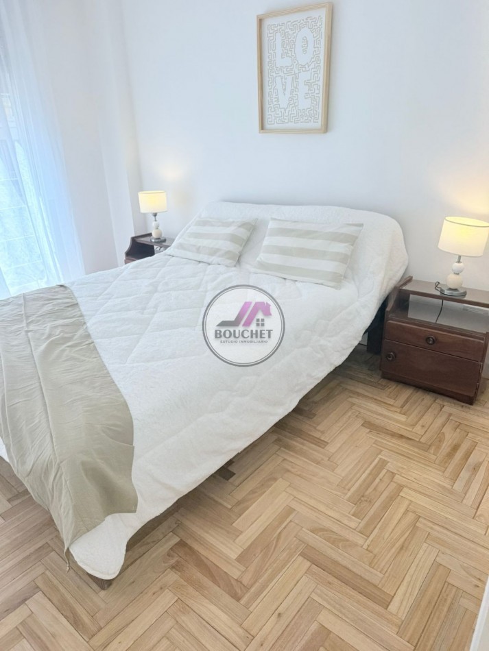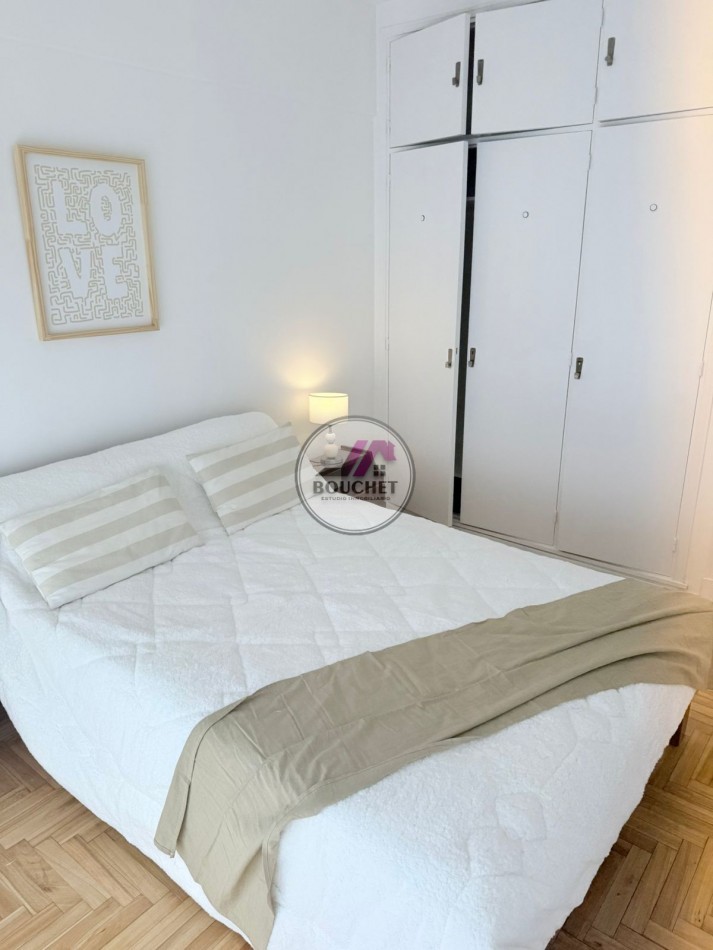* Dormitorio principal a la calle, con balcón francés, pisos de parquet lustrado y plastificado, amplio placard con baulera. Se entrega con cama de dos plazas, mesas de luz y ropa de cama.
