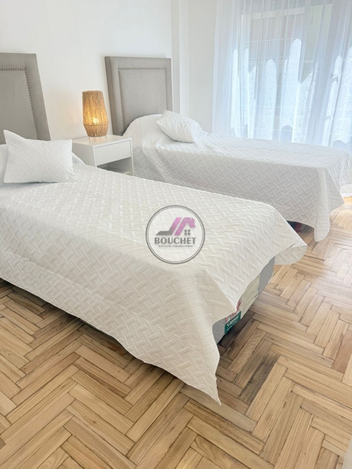 * Segundo dormitorio también al frente, con balcón francés, parquet lustrado y plastificado, placard con baulera, dos sommiers de una plaza con respaldos, mesas de luz y ropa de cama.