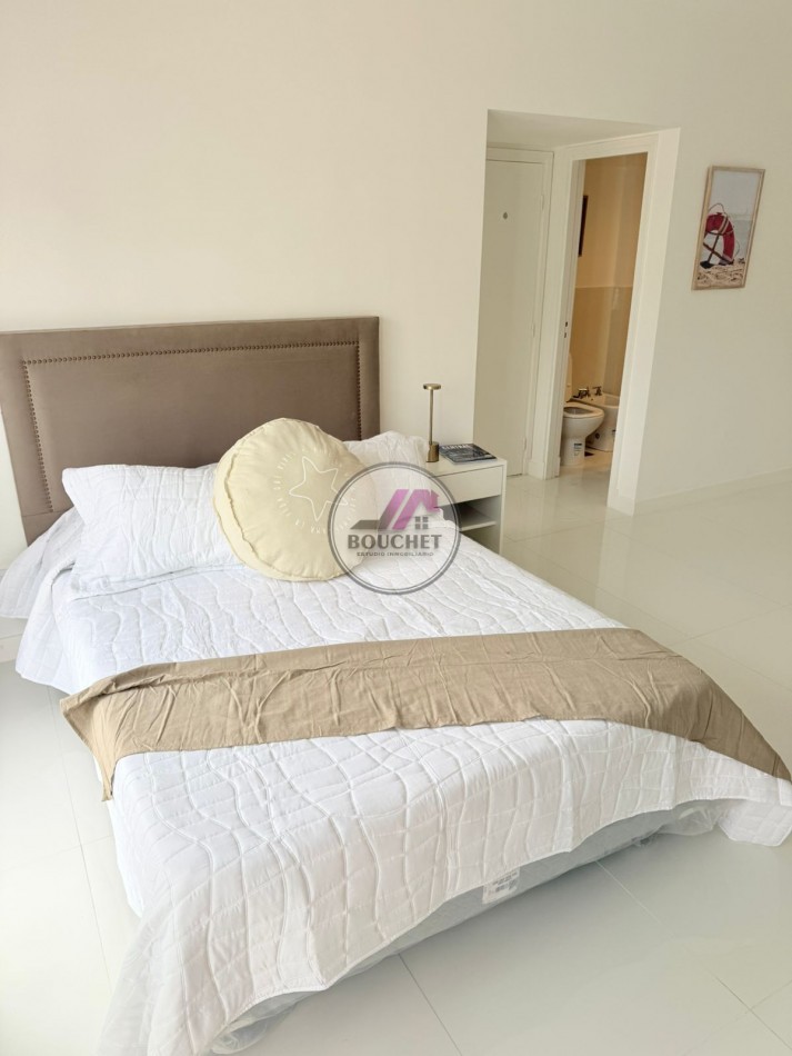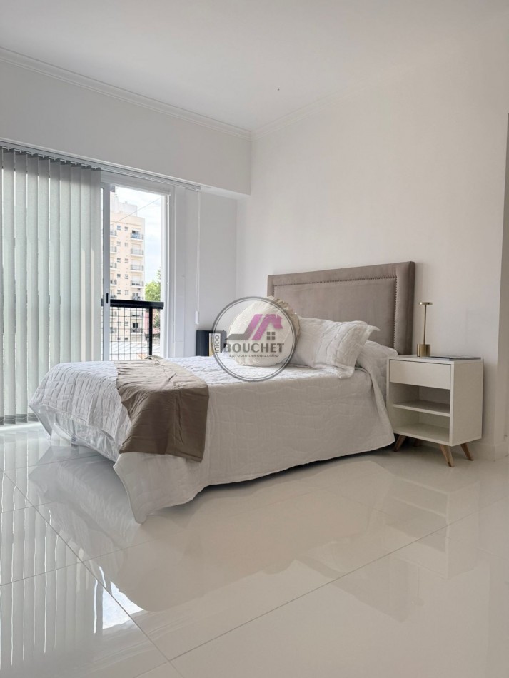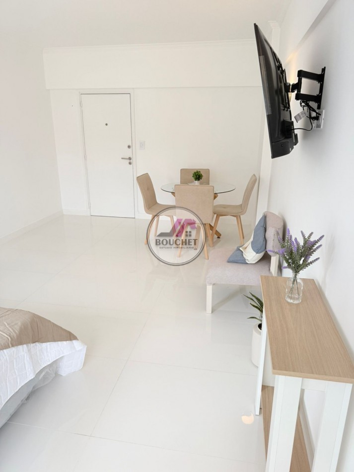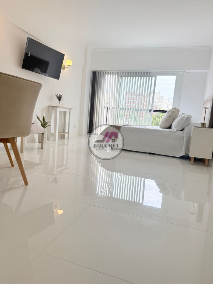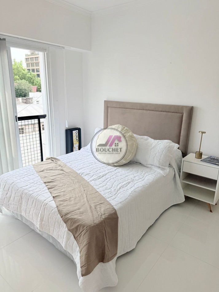 El ambiente es amplio, ideal para living comedor y sector dormitorio, equipado con sommier de dos plazas con respaldo y salida al balcón francés.