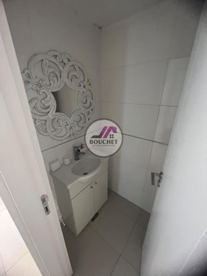 Toilette de recepción. Cocina alargada con espacio de lavadero, barra desayunadora. Horno empotrado, anafe y extractor.